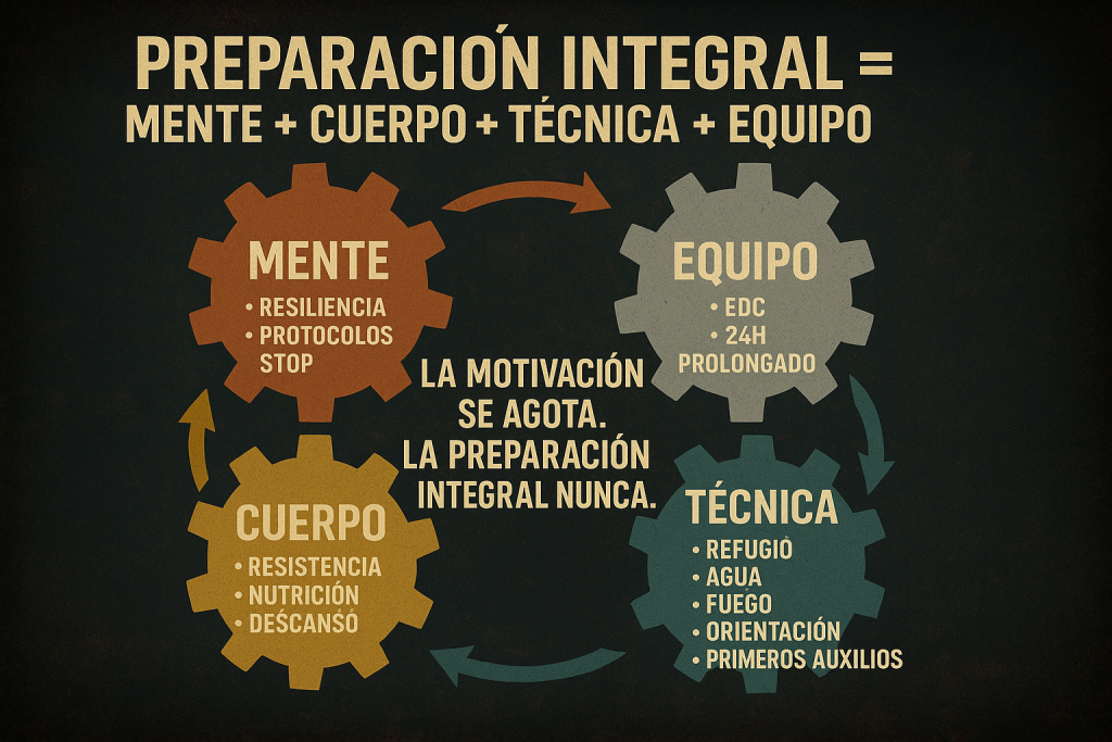 La preparación integral es la combinación de habilidades físicas, mentales, técnicas y logísticas que ayudan a una persona a enfrentar dificultades sin depender solo de factores externos.
