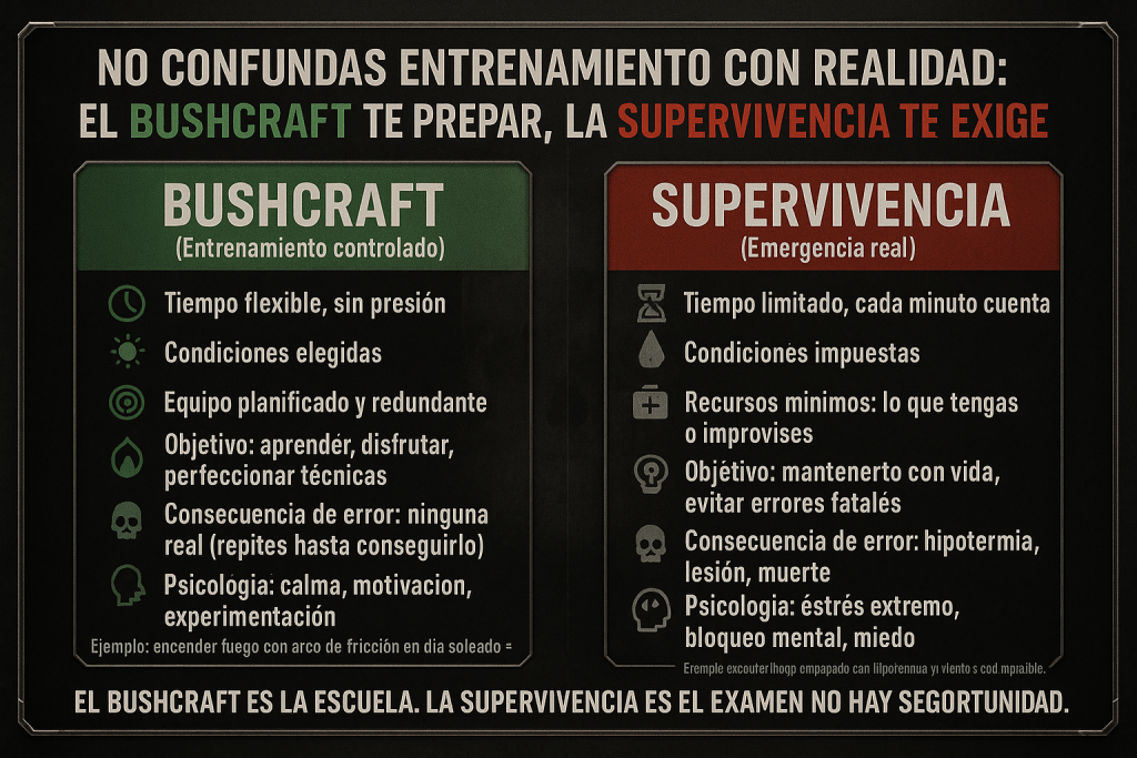 El gran problema surge cuando alguien confunde el entrenamiento controlado con una situación de emergencia real. Esa línea roja puede ser peligrosa. Lo que se cataloga en Bushcraft como una “experiencia de aprendizaje”, en el ámbito de la supervivencia, se transforma en la última carta.