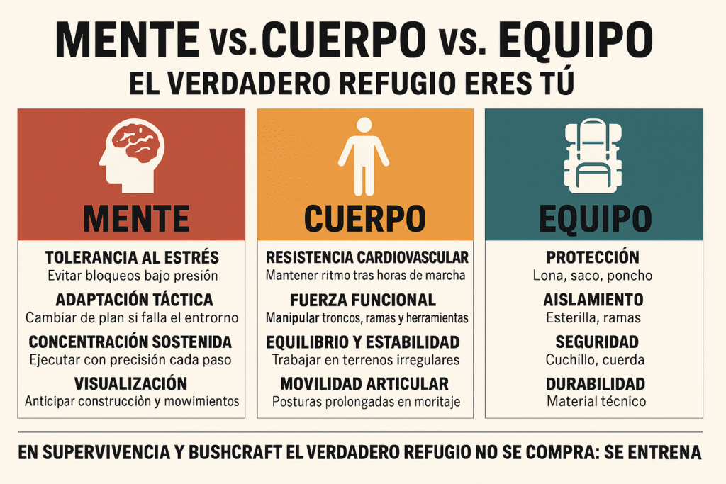 - En el ámbito de la supervivencia, el refugio de mayor relevancia no se adquiere: se entrena. La lona puede quebrarse, la cuerda puede desgastarse y el cuchillo perder su filo, pero tu mente y tu cuerpo son los únicos medios que permanecerán contigo eternamente.