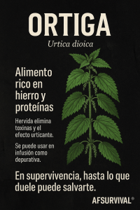 Urtica dioica (ortiga mayor) | Hojas jóvenes | Rica en hierro, alimento, purifica sangre | Hervir para eliminar tóxicos |