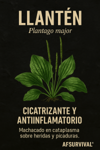 Plantago major (llantén) | Hojas | Antiinflamatorio, cicatrizante, mordeduras de insectos | Machacadas como cataplasma |